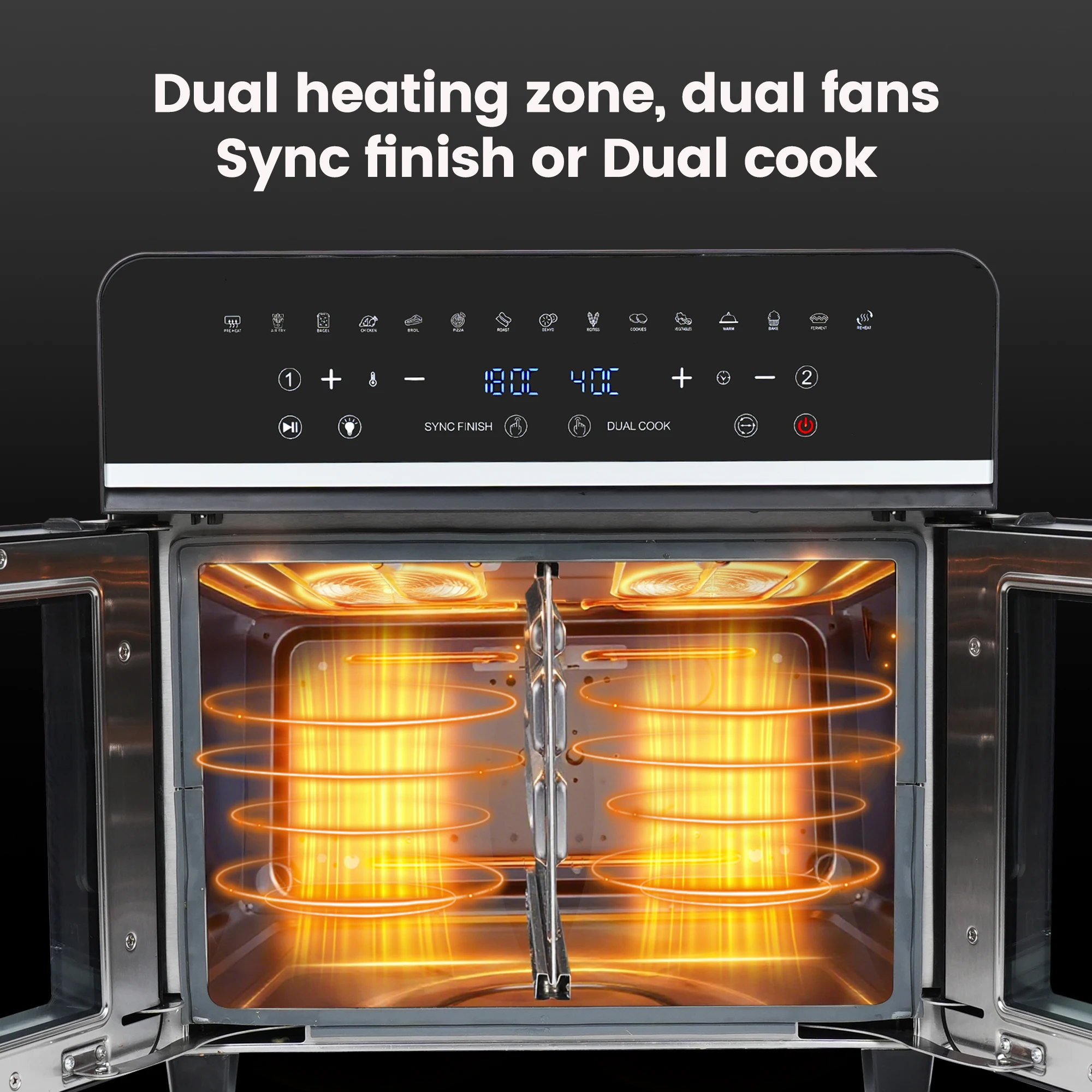 Double zone : Friteuse à air chaud à double porte avec 2 zones de température. Synchronisez les temps et les réglages de cuisson pour que tous vos plats soient prêts simultanément. Plat principal ou accompagnements, ajustez la préparation avec précision et cuisez le tout en même temps : l’essence même d’un mini-four Airfryer.