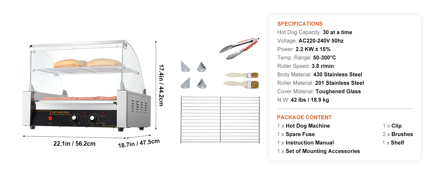 - Disposer jusqu'à 6 saucisses sur les rouleaux chauffants